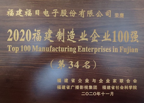 2020年11月20日,2020福建企業(yè)100強研究發(fā)布大會暨福建企業(yè)家大講壇在寧德市舉行,福日電子總裁楊韜受邀參會。會上公布了2020福建企業(yè)100強、福建制造業(yè)企業(yè)100強等榜單,福日電子入選2020福建制造業(yè)企業(yè)100強(第34名)。