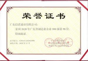 2020年11月26日,由廣東省制造業(yè)協(xié)會(huì)、廣東省發(fā)展和改革研究院、暨南大學(xué)產(chǎn)業(yè)經(jīng)濟(jì)研究院主辦的“2020廣東省制造業(yè)發(fā)展年會(huì)暨廣東省制造業(yè)500強(qiáng)企業(yè)峰會(huì)”在中山市舉行。本屆年會(huì)以“推動(dòng)制造業(yè)高質(zhì)量發(fā)展——擁抱5G+工業(yè)互聯(lián)網(wǎng)、搶抓國內(nèi)大循環(huán)機(jī)遇”為主題,會(huì)上發(fā)布了2020年廣東省制造業(yè)500強(qiáng)企業(yè)研究報(bào)告,福日電子二級(jí)控股子公司廣東以諾通訊有限公司榮列2020年廣東省制造業(yè)企業(yè)500強(qiáng)第98位。