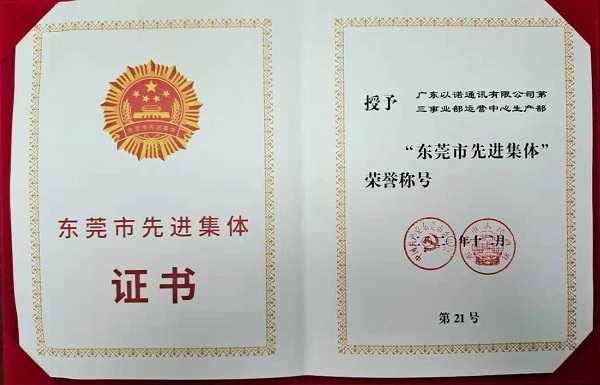 2020年12月25日,2020年東莞市勞動(dòng)模范、先進(jìn)工作者和先進(jìn)集體表彰大會(huì)在該市會(huì)議大廈舉行,大會(huì)表彰了全市54名勞模、6名先進(jìn)工作者以及30個(gè)先進(jìn)集體,福日電子二級(jí)控股子公司廣東以諾通訊有限公司第三事業(yè)部運(yùn)營中心生產(chǎn)部被授予“東莞市先進(jìn)集體”榮譽(yù)稱號(hào)。該部門通過成立員工關(guān)愛委員會(huì)、制定“杰出工匠”“百夫長”方案、落實(shí)疫情防控工作、設(shè)立員工問題反饋信箱、組織各類文體活動(dòng)等舉措,推動(dòng)部門各項(xiàng)工作順利開展,為公司做強(qiáng)做優(yōu)做大通訊產(chǎn)業(yè)貢獻(xiàn)力量。