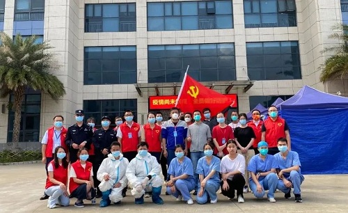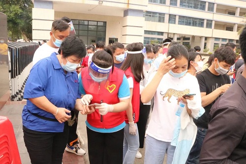 從早上8點(diǎn)半起,周邊企業(yè)的員工們就分批來到等待區(qū)域?!罢埻@里走?!薄奥闊┏鍪疽幌滦谐檀a。”一抹抹白色與紅色交織的身影,正在進(jìn)行現(xiàn)場分流引導(dǎo)、幫忙查詢行程,他們正是由邁銳光電黨支部黨員和入黨積極分子組成的7人志愿者隊伍。在他們的助力下,現(xiàn)場每個步驟環(huán)環(huán)相扣、有條不紊,在當(dāng)日16時即完成全部6500余人的核酸檢測工作,讓黨旗在防疫一線高高飄揚(yáng)。
